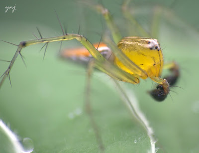 Had to do something with my new toy.. so went to the bushes on baron land behind my building... and guess what i found!! Frankly speaking it was sheer coincidence i found this one.. almost impossible to spot it by a casual onlooker.. i saw some "yellow" movement below a tiny leaf.. then it was matter of waiting for a few mins till his gentleman appeared on the front of the leaf in full colors.